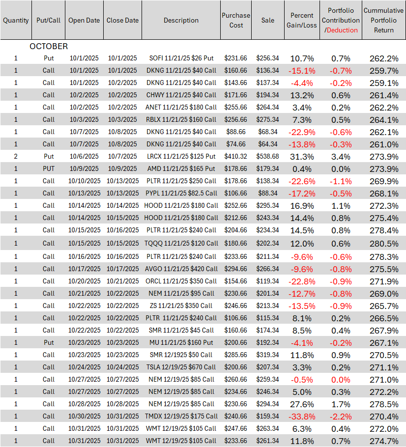 Most investors struggle with options trading in large part because of a lack of a disciplined risk control process, whereas our subscribers are systematically profiting from market volatility in both directions, by capturing winners and managing losses with established risk limits. Since July 2024, as of 10/31/25, our options trading portfolio has delivered a remarkable 274.7% return, dramatically outpacing the S&P 500's 17.4% gain.